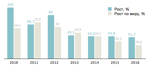 Рис.: Рост рынка мобильной рекламы 2010-2016 годы, %. Источник: оценка исследовательских компаний eMarketer и ComScore, 2013 год и прогноз на 2016 год.