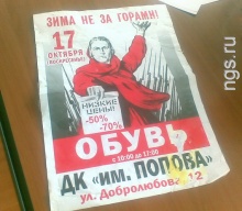 В октябре прошлого года на улицах Новосибирска появились рекламные плакаты, зазывавшие на однодневную распродажу дешевой обуви в ДК им. Попова. Плакат при этом представлял собой вольную трактовку знаменитой работы художника Ираклия Тоидзе «Родина-мать зовет!», агитировавшей советских граждан отправляться на фронт с начала Великой Отечественной войны.