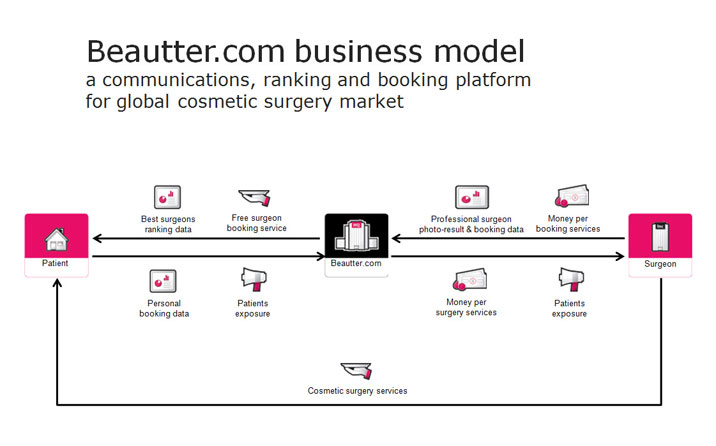 Если хирург поделится с «Бьюттером» данными о своих профессиональных достижениях, стоимости услуг и рабочем графике [Professional surgeon photo-result & booking data] и станет ему отстегивать проценты от заказов [Money per booking services], то получит взамен внимание [Patients exposure] и деньги [Money per surgery service] пациентов, которых он (хирург) станет делать красивыми [Cosmetic surgery service].